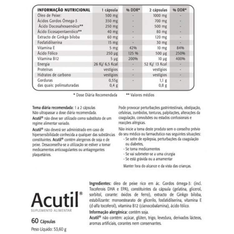 Acutil é um suplemento alimentar que ajuda a combater o cansaço, stress, carências nutricionais e melhorar o desempenho cognitivo. Ajuda a manter a função cerebral principalmente em idades mais avançadas. A sua formulação inclui propriedades antioxidantes e contém ácidos gordos, ginkgo biloba, vitamina E, fosfatidilserina, vitamina B12 e ácido fólico.