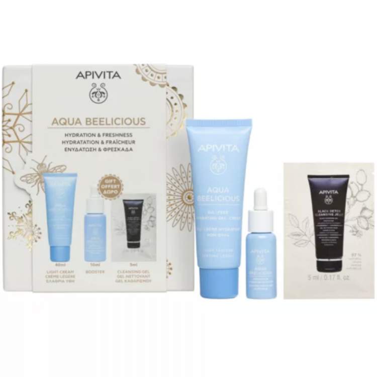 Coffret Aqua Beelicious: Gel Creme de 40ml + Booster de 10ml + Gel Limpeza de 5ml.