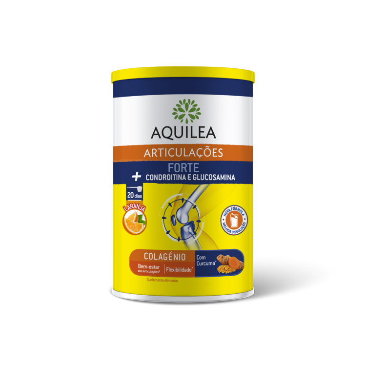 AQUILEA ARTICULAÇÕES FORTE em pó é um suplemento alimentar à base de Colagénio, Glucosamina, Condroitina, Curcuma, Ácido hialurónico e Vitamina C. • Colagénio, uma proteína que se encontra naturalmente nas cartilagens, ossos e pele. As proteínas, como o colagénio, contribuem para a manutenção dos ossos e dos músculos em condições normais. • Glucosamina, uma substância que se encontra de forma natural no corpo e que está envolvida na formação dos ligamentos, dos tendões e das cartilagens. • Condroitina, uma substância que se encontra nas cartilagens em redor das articulações. • Curcuma, que ajuda a manter a flexibilidade e o bem-estar das articulações, assim como manter uma boa mobilidade. • Ácido Hialurónico, um componente essencial que se encontra de maneira natural nas articulações. • Vitamina C, que contribui para a normal formação de colagénio e para o normal funcionamento das cartilagens, dos ossos e da pele. TOMAR Tomar 1 colher doseadora por dia (incluída na embalagem) diluída num copo de água (200ml), sumo, leite, chá, iogurte, etc. Composição: Maltodextrina (agente de volume), colagénio hidrolizado, glucosamina sulfato, extrato de Curcuma (Curcuma longa, raíz), ácido cítrico (acidificante), sulfato de condroitina, aroma de laranja, L-ascorbato sódico, sucralose (edulcorante), ácido hialurónico.