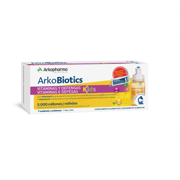 ARKOBIOTICS VITAMINAS E DEFESAS KIDS é um suplemento alimentar à base de vitaminas e fermentos lácteos vivos. As vitaminas A, B6, B12, C e D contribuem para o normal funcionamento do sistema imunitário. Oferece uma seleção de fermentos lácteos provenientes de diversas estirpes. O processo de liofilização garante a toma mínima de 5.000 milhões de fermentos selecionados** por unidose.