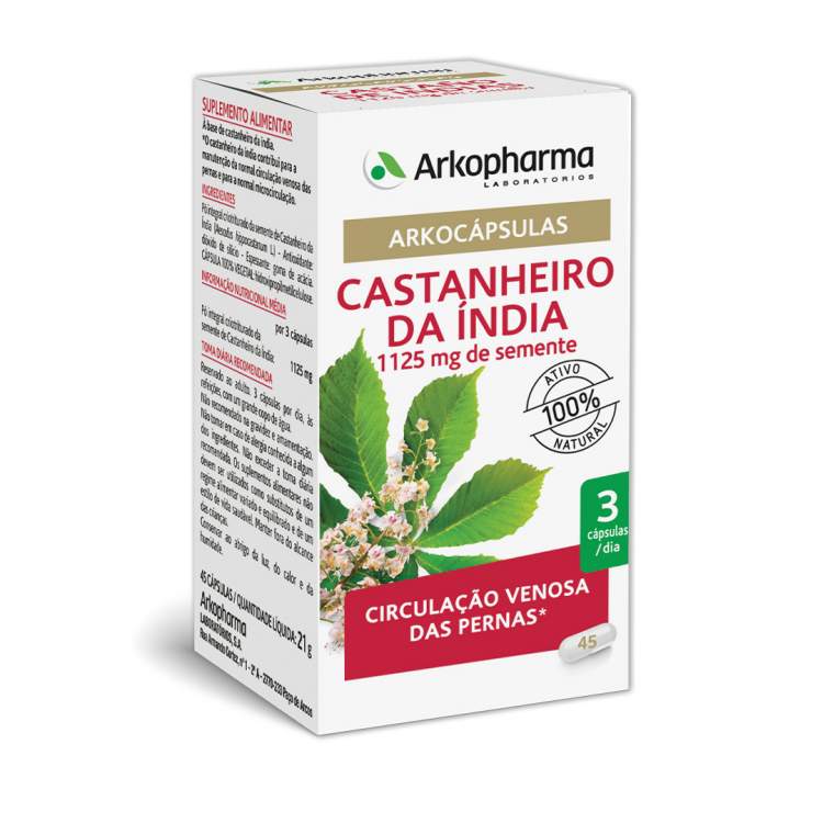[CIRCULAÇÃO] Suplemento alimentar à base de Castanheiro da Índia, que contribui para a manutenção da normal circulação venosa das pernas e para a normal microcirculação. Cada cápsula contém 275mg de pó integral criotriturado da casca de Castanheiro da Índia (Aesculus hippocastanum L.) com um teor mínimo de 2% de esculósido. Tomar 3 cápsulas por dia, com as refeições, com um grande copo de água.