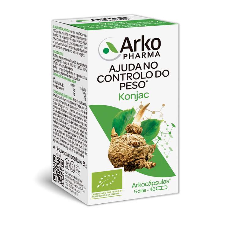 [PESO CORPORAL, ELIMINAÇÃO LÍQUIDOS] Suplemento alimentar à base de Konjac, rico em Glucomanano que contribui para a perda de peso. O efeito benéfico é obtido com uma dose diária de 3g de glucomanano em três doses de 1g cada, juntamanete com 1 a 2 copos de água, antes das refeições e no âmbito de um regime alimentar de baixo valor energético. Cada cápsula contém 500mg de bolbo de Konjac (Amorphophallus konjac K. Koch) em pó. Tomar 3 cápsulas 30 minutos antes do pequeno almoço, do almoço e do jantar, com 1 a 2 copos de água. Deve-se tomar com bastante água para garantir que a substância chega ao estômago e para evitar uma eventual asfixia Tomar 3 cápsulas 30 minutos antes do pequeno almoço, do almoço e do jantar, com 1 a 2 copos de água. Tomar com bastante água para garantir que a substância chega ao estômago e para evitar uma eventual asfixia, especialmente em pessoas com dificuldades de deglutição. Dar pelo menos 2 horas de intervalo entre a toma deste suplemento e a toma de outros medicamentos por via oral.