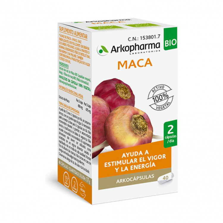[FADIGA e ENERGIA] Suplemento alimentar à base de Maca, uma raiz energizante e revitalizante originária dos Andes Peruanos, que ajuda a manter o rendimento físico e intelectual no homem e na mulher. Também contribui para a manutenção do vigor e desejo sexual. Cada cápsula contém 225mg de extrato seco do tubérculo de Maca (Lepidium meyenii, Walp.). Tomar 3 cápsulas por dia, durante as refeições, com um grande copo de água.