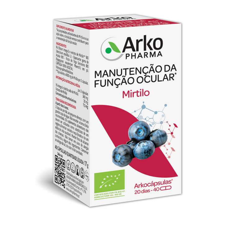 [BEM-ESTAR E CIRCULAÇÃO] Suplemento alimentar à base de Mirtilo rico em antioxidantes e cuja ação sobre a circulação venosa contribui para a manutenção da função ocular. Cada cápsula contém 380mg de pó integral criotriturado de Mirtilo (Vaccinium myrtillus L.) com um teor mínimo de 0,5% de taninos (expressos em pirogalol). Tomar 3 cápsulas por dia, às refeições, com um copo de água. Caso seja necessário, pode aumentar a toma para 5 cápsulas por dia.