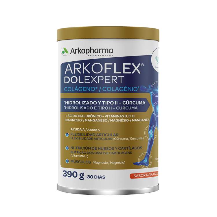 [ARTICULAÇÕES E OSSOS] Suplemento alimentar em pó à base de Colagénio hidrolisado e tipo II nativo, Ácido hialurónico, Magnésio, Manganês, Curcuma e Vitamina C, B1 (Tiamina), B2 (riboflavina), B6, B12 e D, uma associação única e inovadora de ingredientes para ajudar à mobilidade e à nutrição dos ossos, cartilagem e músculos. A Curcuma contribui para a flexibilidade articular. A Vitamina C ajuda na normal formação do colagénio e contribui para o normal funcionamento dos ossos, das cartilagens e da pele. O Magnésio ajuda no normal funcionamento dos músculos. Posologia (reservado ao adulto): 1 colher doseadora por dia (13g), diluída de preferência num grande copo de água ou sumo, à temperatura ambiente.