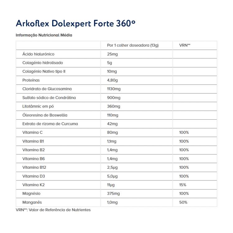 [ARTICULAÇÕES E OSSOS] Suplemento alimentar em pó à base de Colagénio hidrolisado e Colagénio nativo tipo II, Ácido hialurónico, Magnésio, Manganês, Glucosamina, Condroitina, Litotâmnio, Boswelia, Curcuma e 7 Vitaminas. Apresenta uma associação inovadora de ingredientes para uma abordagem 360º do sistema locomotor, que permite o normal funcionamento dos músculos, a normal formação de colagénio e o normal funcionamento dos ossos, das cartilagens e da pele. A Curcuma e a Boswelia melhoram a flexibilidade e o bem-estar articular, quanto que o Cálcio contribui para a manutenção de ossos normais. Posologia (reservado ao adulto): 1 colher doseadora por dia (13g) diluída, de preferência num grande copo de água (200 ml), à temperatura ambiente. Para uma melhor dissolução do produto, recomenda-se adicionar o líquido no final. Agitar energicamente e deixar repousar uns instantes.