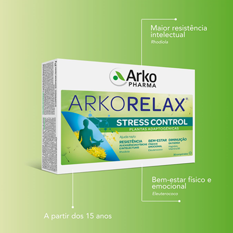 [SONO E STRESS] Suplemento alimentar à base de extratos de plantas adaptogénicas, magnésio e vitamina B6, que fomentam o bem-estar físico e emocional, melhoram a resistência a fatores stressantes e diminuem o scansaço e fadiga. Composição por 2 comprimidos: 300mg de Extrato de raiz de Eleuterococo, 180mg de Extrato de raiz de Rhodiola, 1,4mg de Vitamina B6 (Piridoxina) e 60mg de Magnésio. Posologia (apenas a partir dos 15 anos): em períodos de stress, 2 comprimidos por dia de manhã; em caso de stress pontual, 3 comprimidos por dia, 2 de manhã e 1 ao meio dia. Não tomar após as 17h.