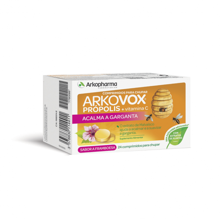 ARKOVOX® Própolis + Vit C sabor a framboesa é um suplemento alimentar à base de extrato de Malvaísco, Papaína, extrato de Própolis e Vitamina C. O extrato de Malvaísco ajuda a suavizar e a acalmar a garganta, faringe e cordas vocais, contribuindo para o bem-estar respiratório. A vitamina C contribui para o normal funcionamento do sistema imunitário. Chupar 1 a 3 comprimidos por dia.