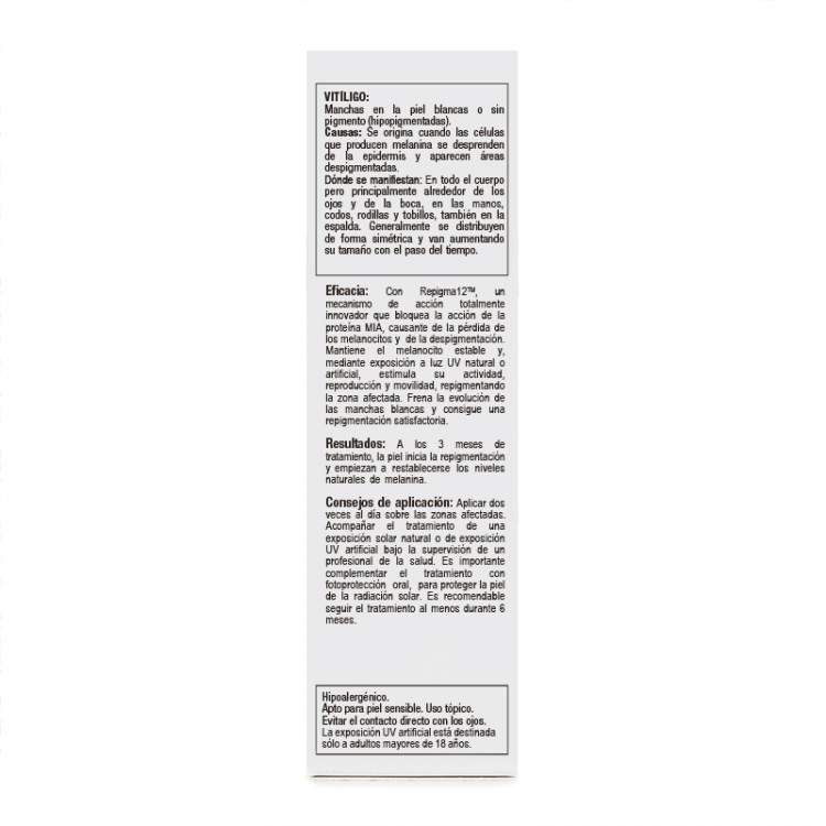 REPIGMENT12® Creme repigmentante - Tratamento cosmético específico para mitigar as consequências estéticas do vitiligo sobre a pele. Inovação: Com o Repigma12™, um inovador mecanismo de ação que bloqueia a proteína MIA, causadora da despigmentação, mantém o melanócito estável e, mediante a exposição à luz UV natural ou artificial, devolve o tom natural à zona despigmentada. Interrompe assim a evolução das manchas brancas e proporciona uma repigmentação satisfatória da zona afetada. Resultados: Com 3 meses de tratamento cosmético, a pele inicia a sua repigmentação e começam a restabelecer-se os níveis normais de melanina. Rosto e corpo. Hipoalergénico. Dermatologicamente testado. Apto para peles sensíveis. Composição: Aqua (Water), Snail Secretion Filtrate, Polyglyceryl-6 Distearate, Propanediol, Betaine, C15-19 Alkane, Glycerin, Isohexadecane, Isononyl Isononanoate, Dimethicone, Isopropyl Isostearate, Tocopheryl Acetate, Acetyl Oligopeptide-185 Amide, Tocopherol, Jojoba Esters, Glyceryl Stearate, PEG-100 Stearate, Phenylpropanol, Polyacrylate-13, Caprylyl Glycol, Cetyl Alcohol, Polyglyceryl-3 Beeswax, Potassium Cetyl Phosphate, Polyisobutene, Xanthan Gum, Sodium Phytate, Polysorbate 20, Citric Acid, Phenoxyethanol, Parfum (Fragrance).