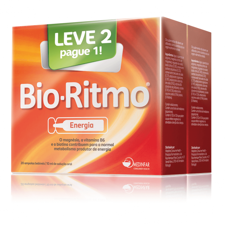 BIO-RITMO é um suplemento alimentar que contém Aspartato de arginina, Vitamina B6, Biotina e Magnésio. O magnésio, a Vitamina B6 e a Biotina contribuem para o normal metabolismo produtor de energia, assim como para o normal funcionamento do sistema nervoso e para uma normal função psicológica. A vitamina B6 e o magnésio contribuem para a redução do cansaço e da fadiga. A vitamina B6 contribui para o normal funcionamento do sistema imunitário. A biotina contribui para a manutenção de uma pele e cabelo normal. O magnésio contribui para a manutenção da estrutura normal dos ossos e dentes. Não contém açúcar.