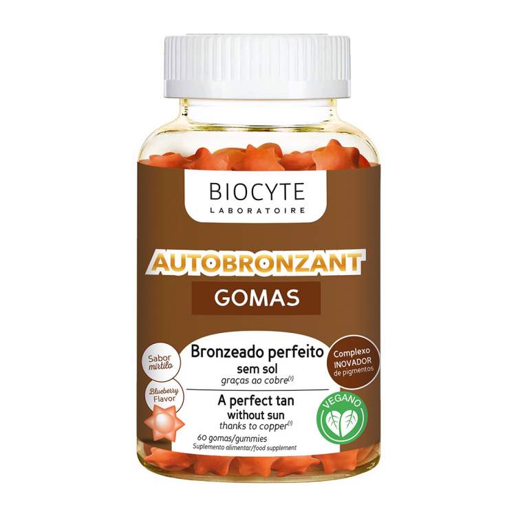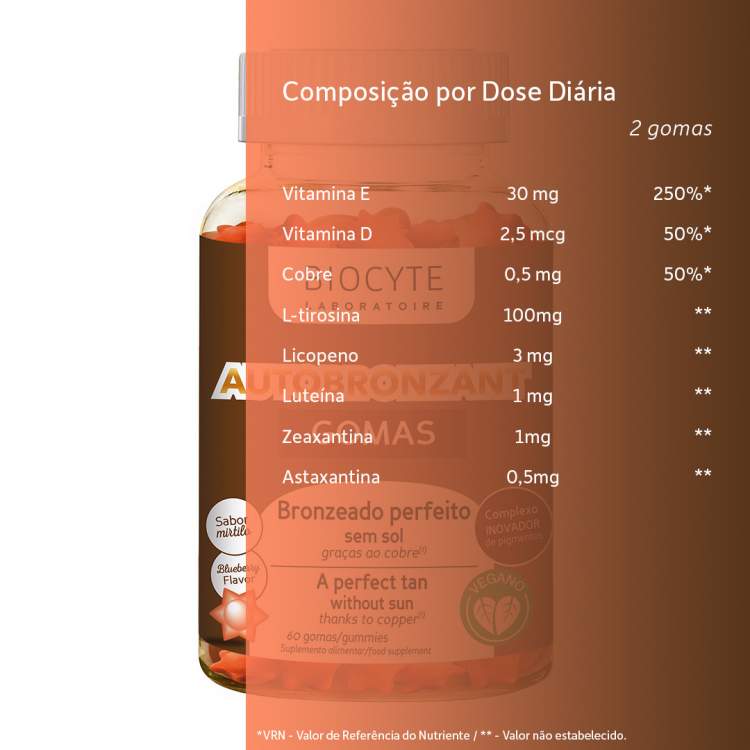 Suplemento alimentar à base de cobre, com um inovador complexo de pigmentos, que bronzeia a pele mesmo sem exposição solar. A sua fórmula inovadora promove um bronzeado saudável, uniforme e com um brilho natural durante todo o ano. Contém Cobre, Vitamina E e D, L-tirosina, Licopeno, Luteína, Zeaxantina e Astaxantina. O complexo de pigmentos e a Vitamina E protegem as células do stress oxidativo, enquanto que o cobre contribui para a normal pigmentação da pele. Tomar 2 gomas por dia, de preferência de manhã. Gomas fabricadas com gelatina vegetal. Guardar num local seco, abaixo dos 25º e protegido da luz solar.