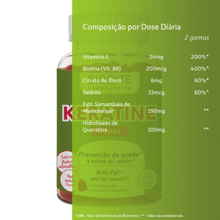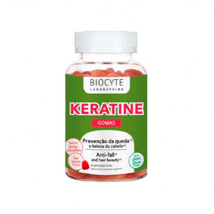Suplemento alimentar à base de queratina, para prevenção da queda e fortalecimento capilar. Ajuda a reforçar a estrutura do fio, para que o cabelo se mantenha saudável, com mais volume, brilho e mais forte. Contribui ainda para ativar a circulação sanguínea do couro cabeludo, protege as células do stress oxidativo e purifica o escalpe. Indicado para cabelos fracos, quebradiços, baços, sem vida e com queda. Contém queratina hidrolisada, Avenca, Biotina, Zinco e Selénio. Fórmula com gelatina vegetal. Tomar 2 gomas por dia, durante 3 meses no mínimo. Guardar num local seco, abaixo dos 25º e protegido da luz solar.