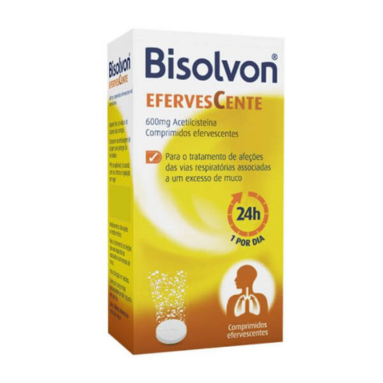 Bisolvon® Efervescente. A eficácia no tratamento da tosse com muco, com apenas um comprimido por dia. Bisolvon® Efeverscente está indicado no tratamento de afeções do trato respiratório com hipersecreção brônquica, para reduzir a viscosidade das secreções de muco e para facilitar a expetoração. Adultos: Um comprimido efervescente de 600 mg uma vez por dia. Cada comprimido efervescente contém 600 mg de acetilcisteína. Contém lactose, sódio e sorbitol. Manter fora da vista e do alcance das crianças. Conservar na embalagem de origem para proteger da humidade. Para utilização em adultos.