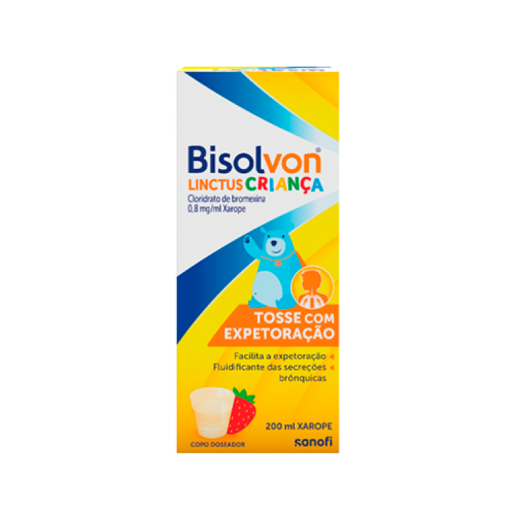 Utilize Bisolvon® Linctus Criança para tratar a tosse com muco em crianças. Confie em Bisolvon® Linctus Criança para tratar a tosse com expetoração, para que possam conviver novamente em harmonia. Bisolvon® Linctus Criança está indicado como adjuvante mucolítico do tratamento antibacteriano das infeções respiratórias em presença de hipersecreção brônquica. Bisolvon® Linctus Criança reduz a viscosidade das secreções brônquicas. O muco tornase mais fluido. Bisolvon® Linctus Criança tem um efeito estimulador sobre a mucosa brônquica para produzir secreções brônquicas mais fluidas. Além disso, fica facilitada a drenagem do material tensioativo dos alvéolos pulmonares e dos brônquios. Juntamente com a ativação do epitélio ciliar da mucosa brônquica, estes mecanismos mantêm e melhoram a capacidade de autopurificação das vias aéreas. Facilita e acelera a eliminação do muco dos alvéolos pulmonares com a sua ação fluidificante e expetorante. As Mães utilizam Bisolvon® há mais de 50 anos. Bisolvon® Linctus Criança facilita a expetoração e fluidifica as secreções brônquicas. Bisolvon® Linctus Criança, xarope para crianças com aroma a morango! Até 3x/dia (máximo): Crianças com menos de 2 anos*: 1,25 ml,3x/dia; Crianças entre 2 e 6 anos: 2,5 ml,3x/dia; Crianças entre 6 e 12 anos: 5 ml,3x/dia; Adultos e crianças com mais de 12 anos: 10 ml,3x/dia. Cada ml de xarope contém 0,8 mg de Cloridrato de Bromexina. Via Oral.