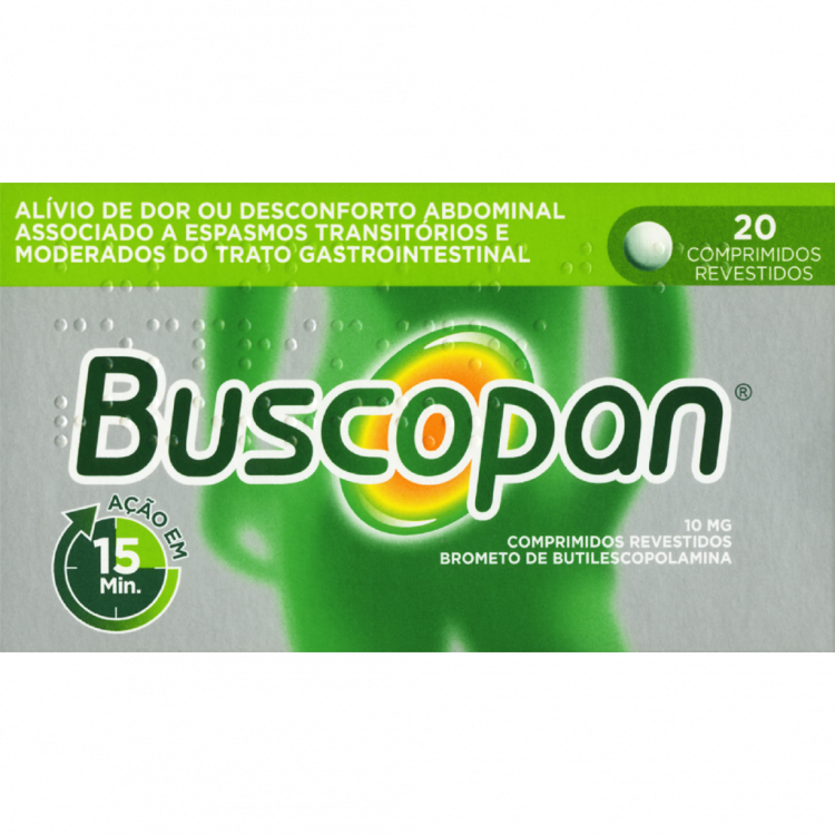 Medicamento não sujeito a receita médica indicado para o alívio da dor de barriga, espasmos ou desconforto abdominal causados por exemplo por stress ou síndrome do intestino irritável. A sua fórmula permite uma ação rápida (em 15 minutos) na origem da dor, sem grande absorção na corrente sanguínea, com boa tolerância e baixa incidência de efeitos adversos. Adequado para adultos e crianças com mais de 6 anos. Contém 10mg de Brometo de butilescopolamina.