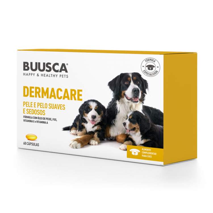 Buusca Dermacare é um alimento composto complementar para cães, especialmente desenvolvido para a pele e pêlo. Possui uma fórmula completa com Óleo de peixe, FOS e Vitaminas A e E, para uma pele e pêlo suaves e sedosos.
