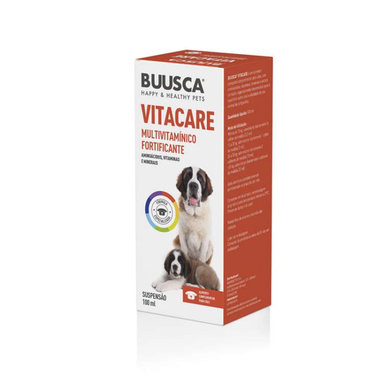 Buusca Vitacare é um alimento composto complementar para cães, com aminoácidos, vitaminas, minerais e extrato de malte, especialmente desenvolvido para o equilíbrio nutricional e vitalidade do seu animal de companhia. Este multivitamínico fortificante possui uma fórmula com aminoácidos, vitaminas e minerais.