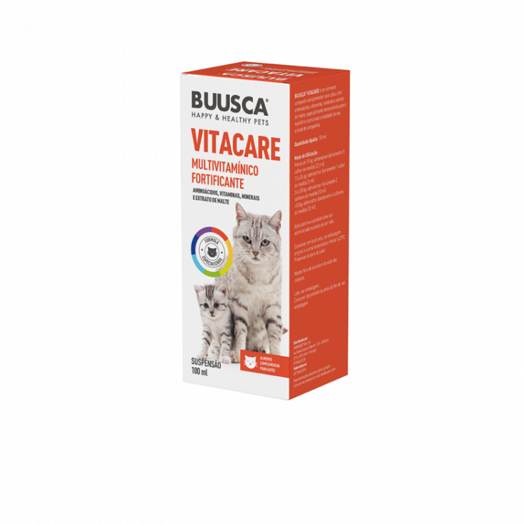Buusca Vitacare é um alimento composto complementar para gatos, com aminoácidos, vitaminas, minerais e extrato de malte, especialmente desenvolvido para o equilíbrio nutricional e vitalidade do seu animal de companhia.