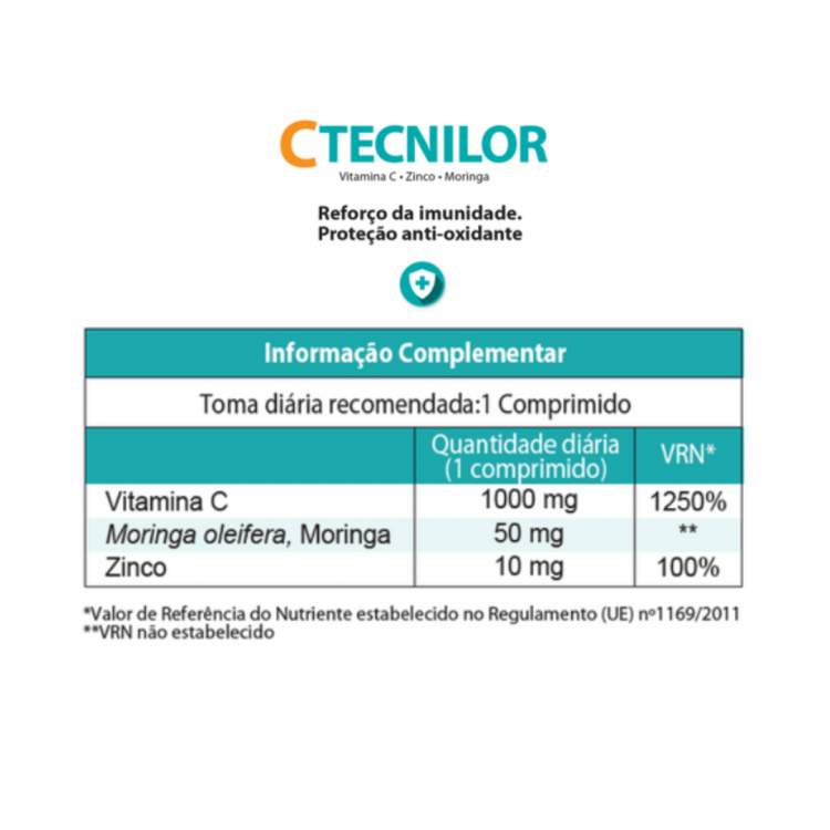 Suplemento alimentar para reforço da imunidade com alto teor em Vitamina C, Zinco e Moringa. Contribui ainda para a redução do cansaço e da fadiga, melhor absorção do ferro e protege as células contra as oxidações indesejáveis. A Moringa ajuda a eliminar bactérias, fungos, vírus, a inibir a inflamação crónica (como a asma e doenças metabólicas) e atenua a irritação das desordens imunulogicas induzidas (intoxicação por metais, efeitos secundarios de medicamentos ou aditivos alimentares). Estudos indicam que as doenças autoimunes como a artrite reumatóide, dermatite atópica e esclerose mútipla podem ser moduladas pela ação da Moringa. Tomar 1 comprimido por dia.