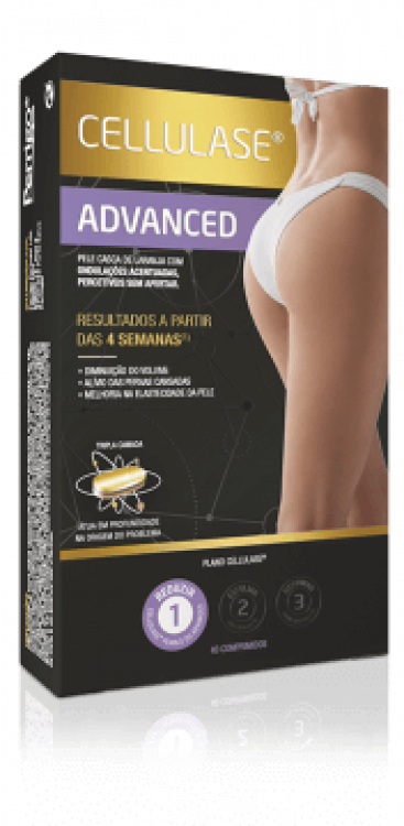 Passo 1 do plano - Cellulase Advanced é a opção ideal para combater os estados mais avançados da pele casca de laranja, com ondulações acentuadas sempre visíveis, mesmo a olho nu. A sua ação baseia-se no complexo natural de tripla camada que permite uma libertação controlada dos ingredientes ao longo do tempo. 1.ª CAMADA – Chá verde e Coleus forskoli – Contribuem para a ativação do metabolismo de gorduras. 2.ª CAMADA – Meliloto e Castanheiro-da-India – Diminuem a retenção de líquidos e contribuem para a melhoria da circulação periférica. 3.ª CAMADA – Centella asiatica e Curcuma – Contribuem para a melhoria da microcirculação.