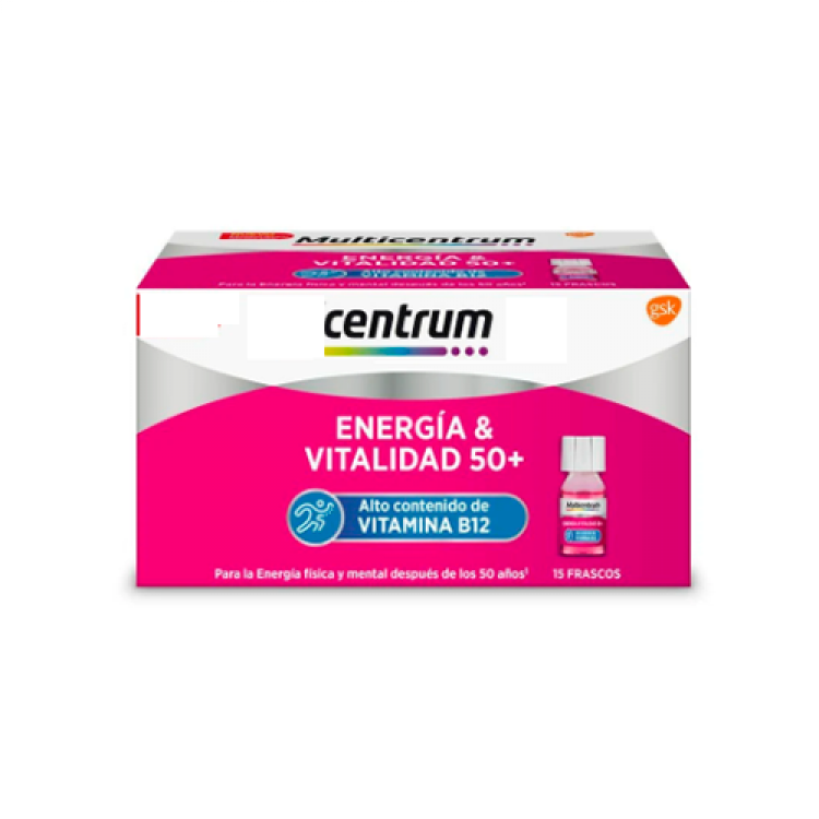 Suplemento alimentar para adultos com mais de 50 anos, com Zinco, Niacina e um elevado teor de Vitamina B12. Fórmula de Centrum Energia & Vitalidade foi desenvolvida para ajudar a diminuir a sensação de cansaço e fadiga assim como a promover um metabolismo energético normal. Contém 500 µg Vitamina B12 (20000% VRN), vitamina hidrosolúvel que é principalmente obtida através de alimentos de origem animal e ajuda a diminuir o cansaço e a fadiga. A elevada quantidade de vitamina B12 confere a característica cor rosa ao produto, 5,4 mg Niacina (33% VRN) (Vitamina B3), contribui para o normal funcionamento do sistema nervoso e 1,5 mg Zinco (15% VRN), mineral que contribui para uma normal função cognitiva. Também adequado para veganos e vegetarianos, uma vez que a vitamina B12 é uma vitamina que o organismo é incapaz de produzir por si só, sendo apenas adquirida através da dieta e estando principalmente presente em alimentos de origem animal. Tomar 1 frasco por dia, todos os dias.