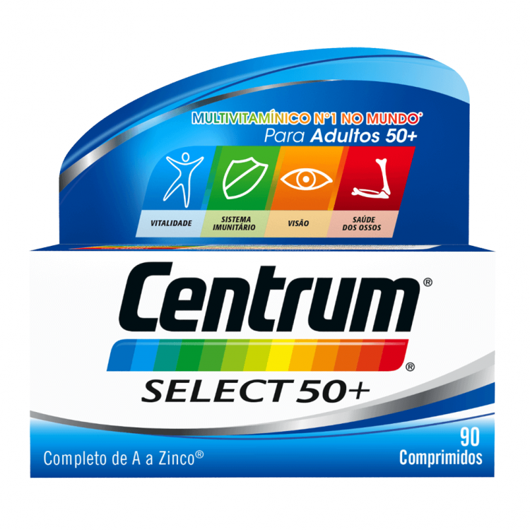 Suplemento alimentar com vitaminas e minerais para uma vida sã, plena de vitalidade e para manter o bem-estar geral depois dos 50 anos. A composição de Centrum Select 50+, em vitaminas e minerais, é especialmente equilibrada para satisfazer as necessidades nutricionais de pessoas com mais de 50 anos. Proporciona múltiplos benefícios: Vitalidade, Sistema Imunitário, Visão e Saúde dos ossos. Com Vitamina B12, que contribui para o normal metabolismo produtor de energia e Vitamina C que contribui para o funcionamento normal do sistema imunitário.