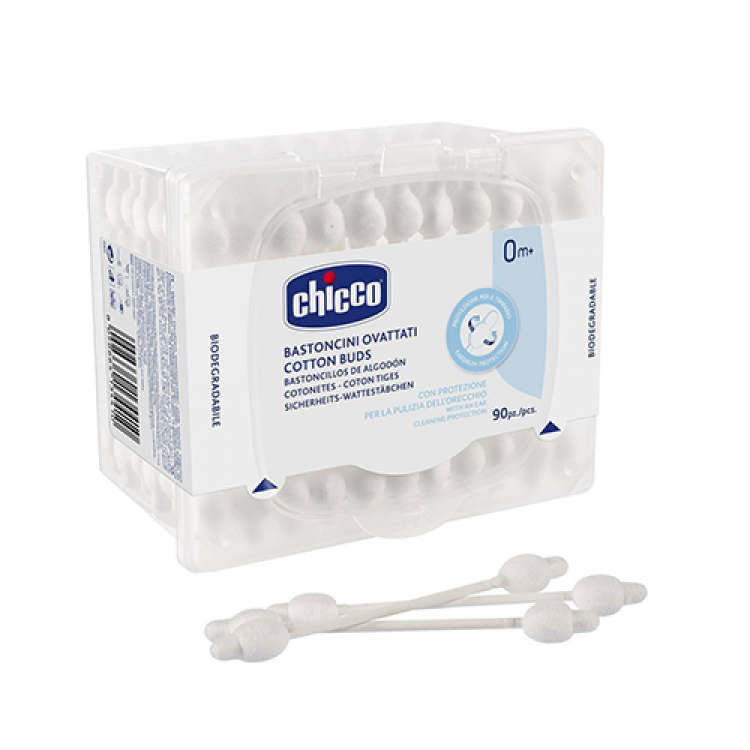 Suaves e flexíveis, em 100% de algodão. Ideais param a higiene dos ouvidos. Os Cotonetes com proteção Chicco proporcionam a limpeza do ouvido dos bebés, garantindo a delicadeza e proteção do tímpano: • Graças à sua estrutura particularmente flexível, os cotonetes removem suavemente as impurezas, garantindo a melhor limpeza e permitindo que o ouvido do bebé fique completamente seco após o banho. • 100% Algodão • Com proteção para não ferir. • Suaves e flexíveis.