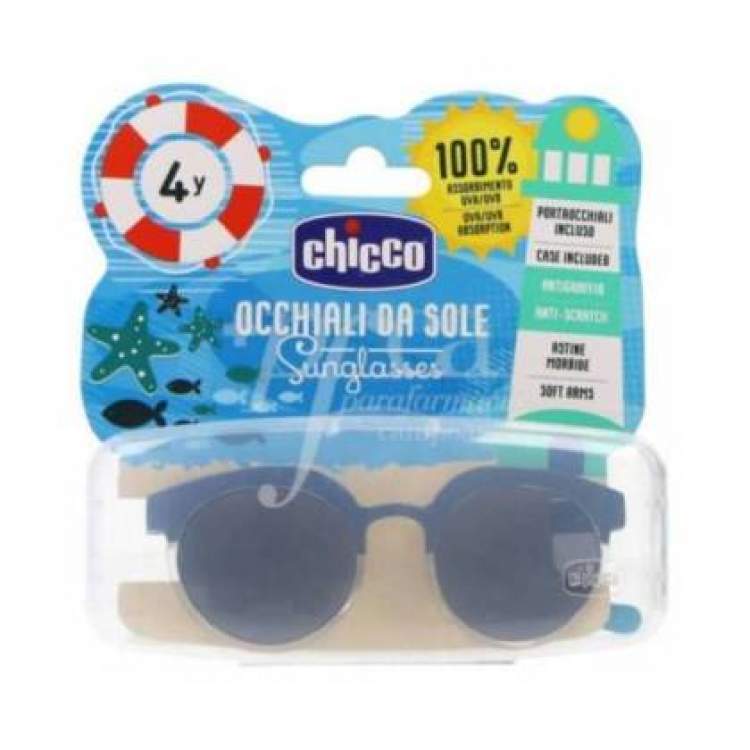 Embalagem com uns óculos de sol Chicco com caixa de armazenamento incluída.