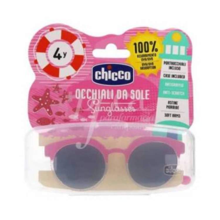 Embalagem com uns óculos de sol Chicco com caixa de armazenamento incluída.