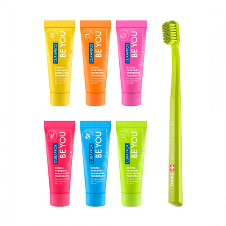 Curaprox BEYOU six pack E se estiver indeciso no sabor, por que não experimentar todos? Indecisão? A variedade é o tempero da vida. Começa uma festa na tua casa de banho com o nosso famoso conjunto [BE YOU.] de seis sabores. Nenhuma festa está completa sem a escova de dentes igualmente elegante Curaprox CS 5460. O pacote de seis sabores para iniciados: todos os seis novos e arrojados sabores de pasta de dentes num só conjunto. Experimenta-os todos, um após o outro. Experimenta, sente e decide qual te fica melhor. O teu dia. O teu estado de espírito. O que têm em comum: ingredientes naturais e essências de ervas, combinados de novas formas para a saúde oral e dentes mais brancos. Com pérolas poderosas de mentol para uma frescura de longa duração! Protege contra cáries dentárias. Confere um hálito fresco e duradouro. Protege contra a sensibilidade dentária. Suporta a ação naturalmente protetora da saliva. Previne o aparecimento de aftas. Minimiza a placa dentária. Cuida das gengivas. O flúor é indispensável. A hidroxiapatita e a oxidase da glucose, juntamente com ingredientes naturais, asseguram um efeito branqueador enzimático que é suave nos teus dentes. E o xilitol, açúcar de bétula, tem um sabor doce, pois fortalece os teus dentes e combate as bactérias. Extratos de equinácea, laranja amarga, unha do diabo e erva-doce indiana apoiam as tuas membranas mucosas e param a inflamação. Como se não bastasse, a provitamina B5 suporta a formação de novas células. Sem LSS, sem triclosan, sem microplástico. ARD aproximadamente 50. As fragrâncias contêm uma poderosa dose de mentol.