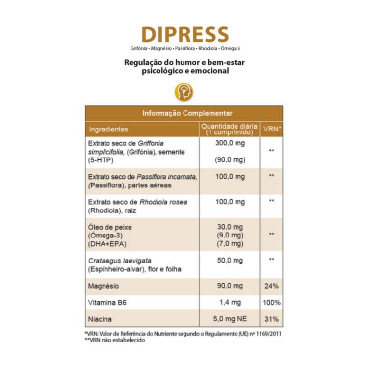 Suplemento alimentar que contribui para um melhor humor, bem-estar psicológico e emocional, normal funcionamento do sistema nervoso, aumenta a resistência ao stress e alivia sintomas associados a estados depressivos ligeiros. Fórmula à base de Grifónia (5-HTP), Passiflora, Rodiola, Vitamina B6, Magnésio e Ómega 3. Tomar 1 comprimido por dia.