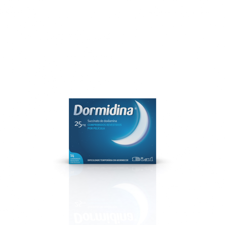 Medicamento não sujeito a receita médica indicado na dificuldade temporária em adormecer. Dormidina é eficaz na redução do tempo de início do sono assim como no aumento da duração do mesmo. Se produzir sonolência diurna deve reduzir-se a dose. Não conduza quando tomar este medicamento. Não administrar mais do que 7 dias seguidos nem a menores de 18 anos, salvo critério médico. Substância ativa: doxilamina (substância anti-histamínica e com efeito sedante). Posologia (maiores de 18 anos): 1 comprimido 30 minutos antes de deitar.
