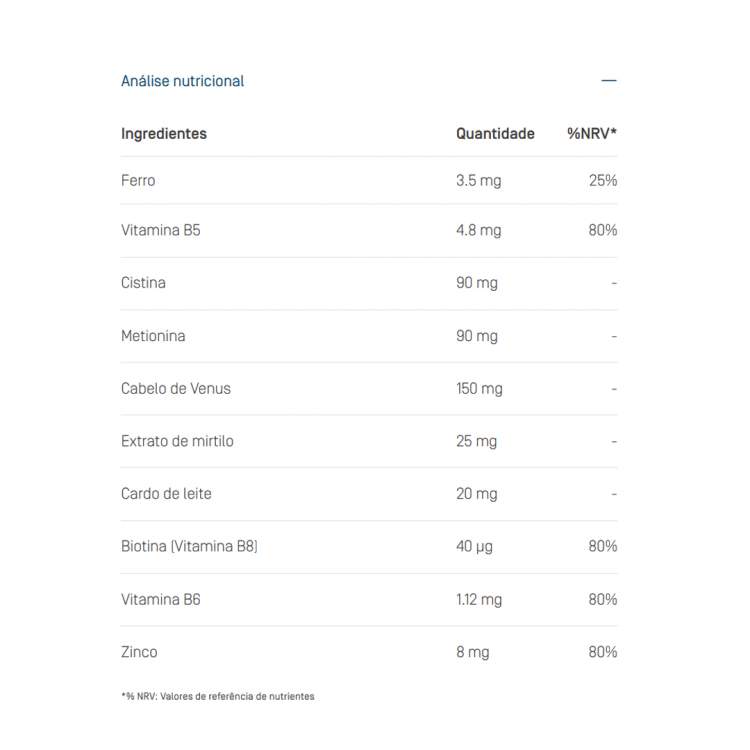Suplemento alimentar para a prevenção da queda do cabelo, que ajuda a melhorar a microcirculação do couro cabeludo e fortificar o cabelo. Fórmula com ingredientes ativos à base de plantas, aminoácidos de enxofre, vitaminas e minerais, também é vegan, não contém glúten e responde a 80% das necessidades de BIOTINA e VITAMINA B8. Tomar 1 cápsula de manhã, com alimentos. Recomenda-se uma toma continuada de pelo menos 3 meses. Destinado a adultos e adolescentes a partir dos 15 anos, não recomendado para grávidas nem lactantes, pessoas a tomar medicação antidiabética e pessoas que sofrem de doenças que conduzem a uma acumulação anormal de ferro.