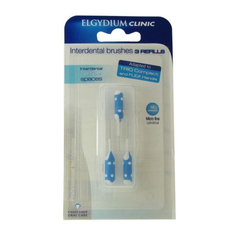 ESCOVILHÕES ELGYDIUM CLINIC ESCOVILHÕES RECARGAS adaptam-se aos cabos dos modelos ELGYDIUM CLINIC TRIO COMPACT e ELGYDIUM CLINIC FLEX. Estão disponíveis em 4 tamanhos. Cada tamanho tem uma cor correspondente, com diâmetro de arame específico (entre 0,38 e 0,80 mm) e diâmetro de cerdas específico (entre 1,9 e 8 mm) para se adaptar a todos os tamanhos dos espaços interdentários.Têm ainda cerdas bicolores: brancas para revelar as gengivas sensíveis em caso de sangramento, e pretas, mais finas, para facilitar a inserção da escova e visualizar a eliminação da placa bacteriana.