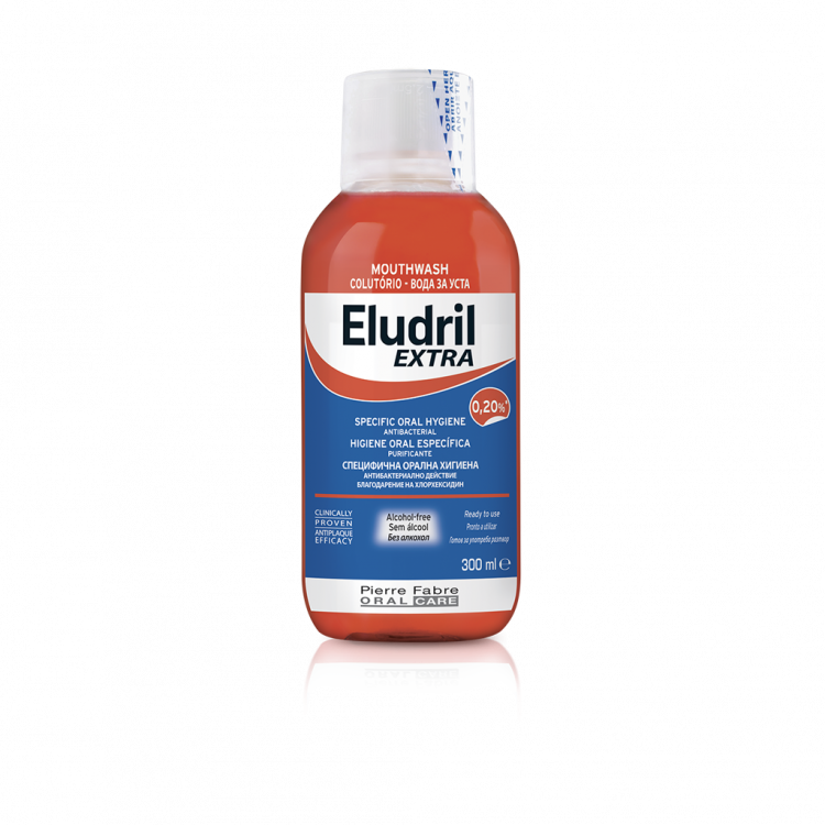 ELUDRIL Extra ajuda a combater a formação da placa bacteriana e a prevenir o desenvolvimento ou agravamento dos problemas das gengivas, contribuindo para uma melhor saúde oral. Conta com uma concentração ótima de cloro-hexidina 0,20% e um efeito prolongado até 12 horas. ELUDRIL Extra pode ser utilizado como complemento em tratamentos periodontais ou implantares. Efeito Prolongado Limpeza Sem álcool A partir dos 6 anos. Aplicação: Duas vezes por dia, após a escovagem dos dentes, bochechar com 15 ml de ELUDRIL Extra durante 30 segundos.