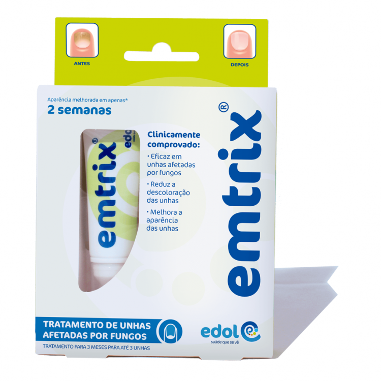 Tratamento para unhas afetadas por fungos (onicomicose) ou psoríase, que melhora a sua aparência em apenas 1 semana. Emtrix melhora a aparência das unhas descoloradas e deformadas, graças ao seu efeito queratolítico físico que degrada as células fúngicas que provocam tipicamente as infeções fúngicas das unhas. Aumenta ainda a hidratação e suaviza as camadas exteriores da unha e ajuda a manter a unha em boas condições. através da alteração do microambiente e melhoramento da integridade da superfície da unha. Os primeiros sinais de melhoria são normalmente observados após uma a duas semanas de tratamento. Num estudo clínico, 76% dos utilizadores verificaram uma melhoria da aparência das unhas em apenas 1 semana, e 92% após 8 semanas. Modo de utilização: Aplique Emtrix uma vez por dia nas unhas afetadas, sobre a unha e no espaço livre por baixo da unhas afetada, preferencialmente à noite antes de se deitar. Composição: Propilenoglicol, ureia, glicerol, ácido láctico, água, hidróxido de sódio, EDTA dissódico. Cada embalagem permite o tratamento durante 3 meses para até 3 unhas.