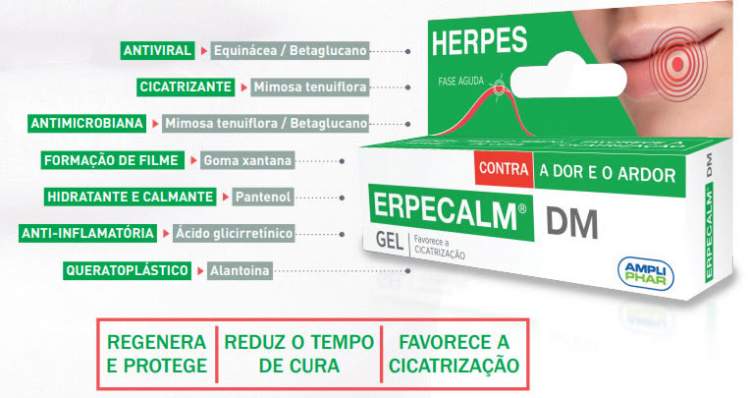 Erpecalm DM Gel é um gel que forma um Biofilme protetor transparente sobre o herpes labial, que ajuda a reduzir a dor e o ardor, acelerar o processo de cicatrização, criar um efeito barreira, prevenir a propagação do vírus e reduzir o tempo de cura. Aplicar uma camada de ERPECALM® DM na zona afetada aos primeiros sintomas. Repetir várias vezes ao dia, mantendo a área afetada sempre coberta de gel. Aplicar até total recuperação da lesão do herpes labial.