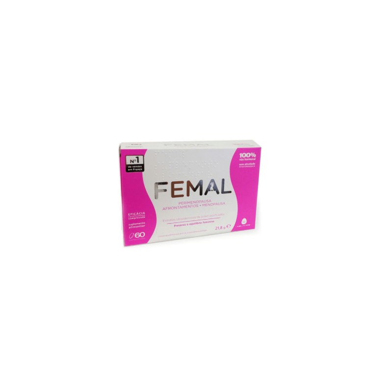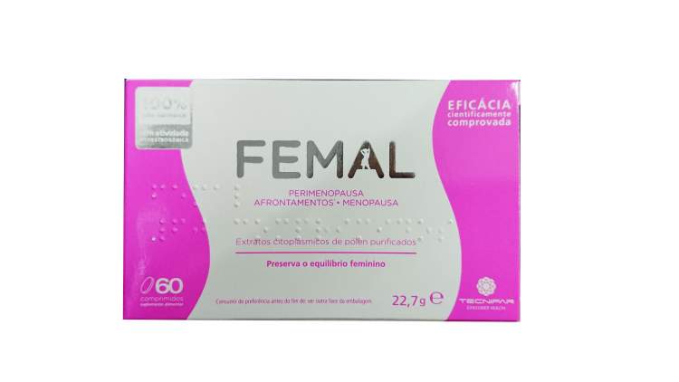 Femal ajuda a preservar o equilíbrio feminino na menopausa. A sua formulação com extratos citoplásmicos de pólen purificados e vitamina E ajudam a diminuir o desconforto, a reduzir os afrontamentos, diminuir o cansaço e apoiar a resistência do organismo durante a menopausa. Posologia: 2 comprimidos de manhã ou à noite. Composição por 2 comprimidos: 320mg de Extratos de Pólen e 10mg de Vitamina E.