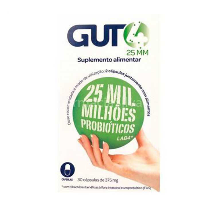 GUT4 25MM é um simbiótico que combina probióticos (composto Lab4®) e prebióticos (frutooligossacarídeos).