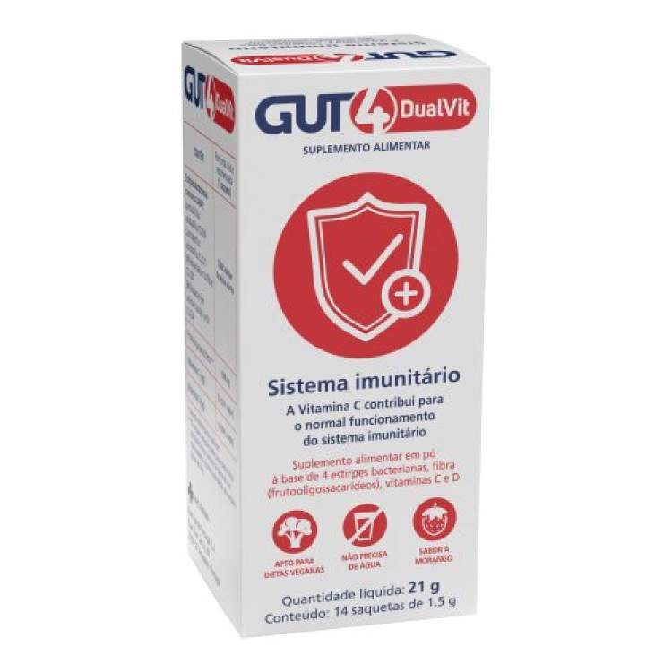 Suplemento alimentar simbiótico, com probióticos, prebióticos, Vitamina C e Vitamina D3, que contribui para o bem estar da flora intestinal e normal funcionamento do sistema imunitário. A sua fórmula contém o composto Lab4 é uma associação de quatro espécies de bactérias benéficas à flora intestinal, que foram expressamente selecionadas, cuidadosamente cultivadas em substratos específicos e misturadas na proporção necessária para otimizar o seu funcionamento. Cada saqueta de GUT4 Dual Vit contém 12,5 mil milhões de bactérias ativas Lab4. Tomar 1 saqueta por dia, diretamente na boca ou diluída em bebidas ou iogurte. Quando usado em associação com antibióticos, e para reforço do sistema imunitário, deverá utilizar as 14 saquetas. Indicado a partir dos 3 anos de idade.