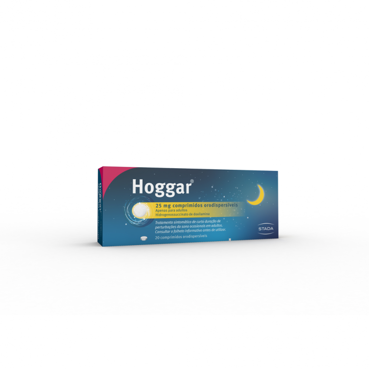 Hoggar comprimidos orodispersíveis contém 25 mg de doxilamina está indicado no tratamento sintomático de curta duração de insónias ocasionais em adultos. Nem todos os distúrbios do sono requerem tratamento médico. Estes são muitas vezes uma expressão de uma doença física ou mental e podem ser influenciados por outras medidas ou tratamento da doença subjacente. Portanto, distúrbios do sono de longa duração não devem ser tratados com Hoggar. Para tal deve consultar o seu médico. Está contraindicado em caso de hipersensibilidade a qualquer componente da formulação; ataque da asma agudo; glaucoma de ângulo fechado; feocromocitoma; hiperplasia prostática; intoxicação com álcool, medicamentos para dormir, dor ou psicotrópicos, epilepsia, tratamento concomitante com inibidores da monoamina oxidase. Deve ser utilizado com precaução especial nas seguintes situações: compromisso renal e hepática; insuficiência cardíaca preexistente e hipertensão; problemas respiratórios crónicos e asma; doença de refluxo gastroesofágico e lesões neurológicas. Como medida de precaução, é preferível evitar a sua utilização durante a gravidez e descontinuar a toma durante o aleitamento. Medicamento não sujeito a receita médica. Leia cuidadosamente as informações constantes da embalagem e do folheto informativo e em caso de dúvida ou persistência de sintomas consulte o seu médico ou farmacêutico.