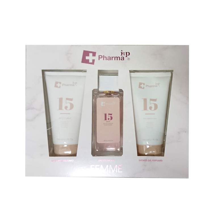 Coffret IAP Pharma Nº15: 1 Loção Corporal de 150ml, 1 Perfume IAP Pharma de 100ml e 1 Gel de Banho de 150ml.