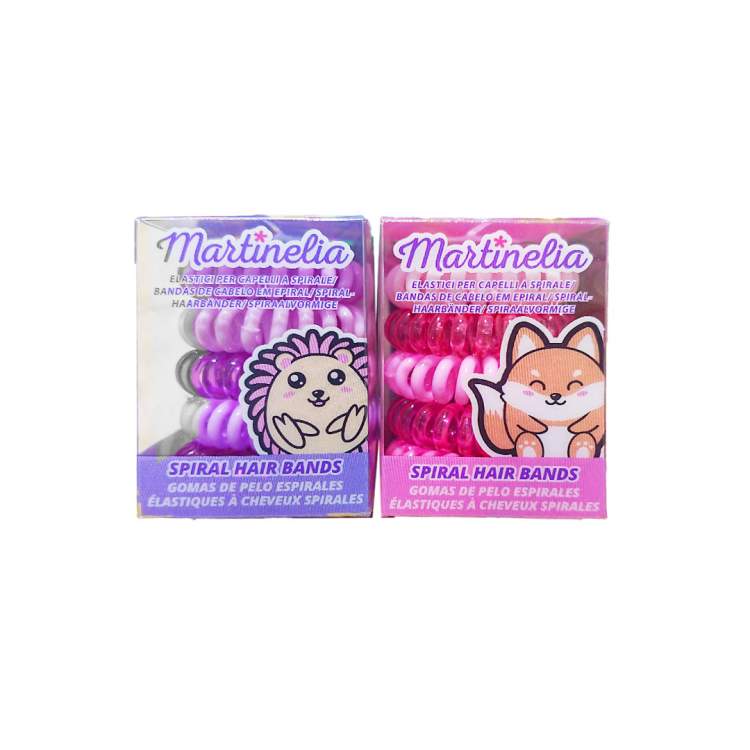 Embalagem com 5 elásticos para o cabelo, em espiral e anti-marcas. Disponível em cor-de-rosa e lilás.