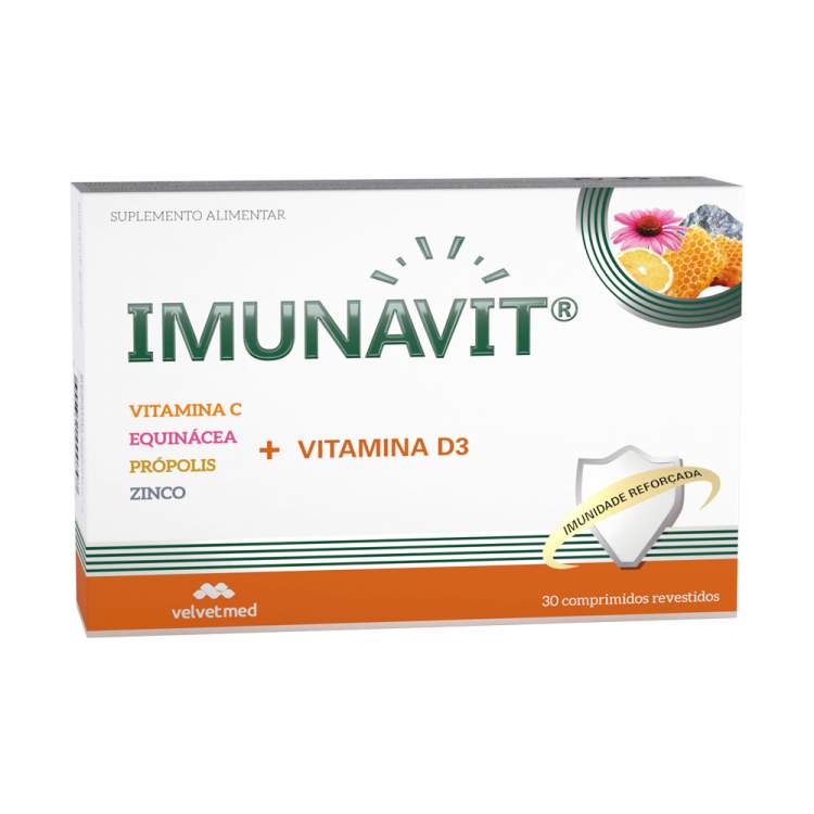 Imunavit Comprimidos é um suplemento alimentar para o reforço do sistema imunitário e complemento no tratamento de doenças do trato respiratório. A sua fórmula inovadora combina as propriedades da Vitamina C e do Zinco com os benefícios da Equinácea, do própolis e da Vitamina D3 e desempenha um papel fundamental no normal funcionamento do sistema imunitário e manutenção da saúde contras as agressões externas diárias. Posologia: 1 a 2 comprimidos por dia (adultos e crianças com mais de 12 anos).
