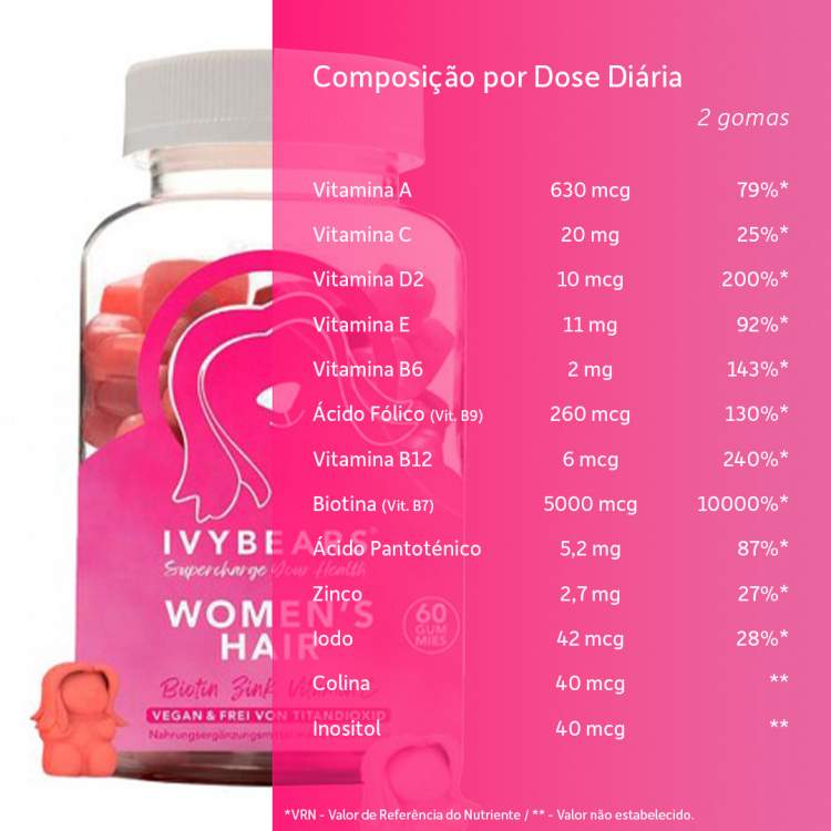 Suplemento alimentar para mulher indicado para a queda capilar e para cabelo quebradiço, baço e sem vida. Ajuda a fortalecer e manter um cabelo saudável, ao mesmo tempo que estimula o seu crescimento. A sua fórmula vegan não contém dióxido de titânio e é rica em Biotina, Ácido Fólico, Vitaminas A, C, D, E, B5, B6, B12 e Zinco. Todos estes são elementos chave para um cabelo forte, brilhante e sedoso. Contribui ainda para o fortalecimento das unhas. Fórmula cientificamente desenvolvida, com fabrico na Alemanha, segundo rigorosos testes de controlo. O facto de ser em gomas, torna-o mais prático e saboroso de tomar, quando comparado com as cápsulas ou comprimidos. Tomar 2 gomas por dia, mastigando-as bem. O tratamento deve ter uma duranção mínima de 3 meses. Para resultados ótimos recomenda-se uma duração de até 6 meses. Não contém aditivos artificiais, glúten, lactose, sorbitol, dióxido de titânio, soja, nem gelatina animal. Contém pectina e a sua cor e sabor são provenientes de uma mistura de bagas. Possui certificação europeia como produto Halal e Kosher. Recomendado para maiores de 16 anos.
