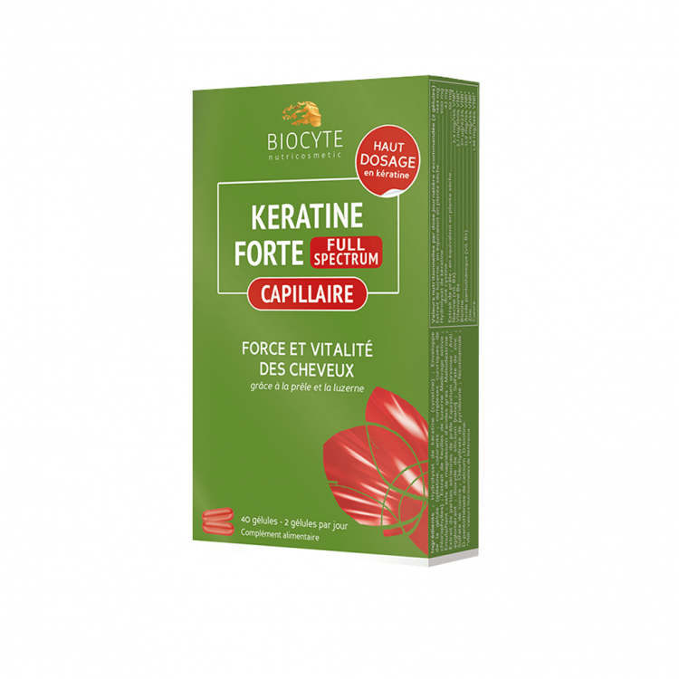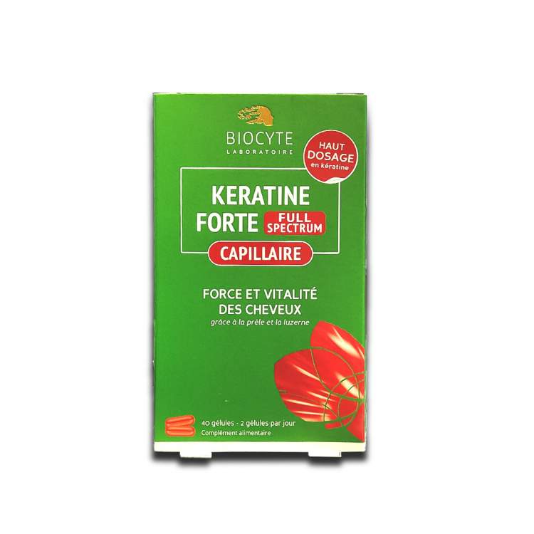 NOTA: PRODUTO COM VALIDADE CURTA (09/2025) Suplemento alimentar rico em queratina para cabelos enfraquecidos, sem força nem vitalidade. Ajuda a reforçar a saúde do seu cabelo e estimular o seu crescimento graças à queratina, extrato de alfafa, biotina e cavalinha. Tomar 2 cápsulas por dia, à hora da refeição. Recomenda-se uma toma mínima de 3 meses para obter os resultados pretendidos.