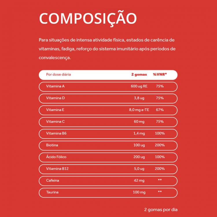 Suplemento alimentar com uma alta proporção de taurina, cafeína e vitaminas B6 e B12, para um efeito revigorante natural na mente e corpo, para um boost de energia ou tarefas mais exigentes. Contribui para manter os níveis de energia, melhorar o desempenho e apoiar o normal metabolismo de energia do organismo. Tomar 2 gomas por dia.