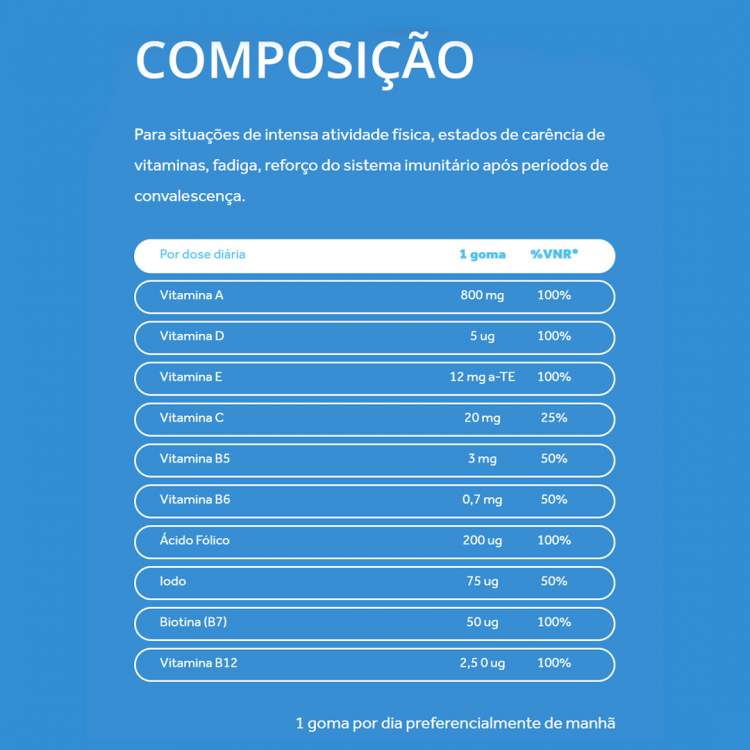 Suplemento alimentar multivitamínico que fornece os nutrientes essenciais necessários em caso de fadiga física e mental, estados de carência de vitaminas e/ou minerais, situações de intensa atividade física, reforço do sistema imunitário e após períodos de convalescença. Tomar 1 goma por dia.