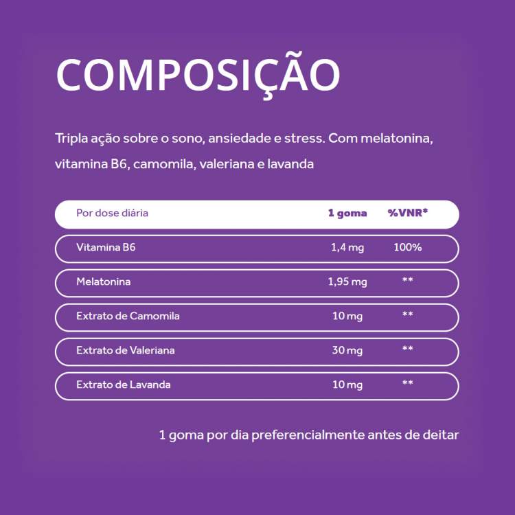 Embalagem com 60 gomas. Tomar 1 goma antes de deitar.
