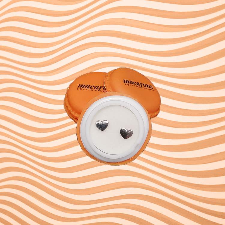 Brincos hipoalergénicos em metal prateado, com textura, em forma de coração. Apresentam-se numa caixinha em formato de macaron, para os poder levar para qualquer lado ou como oferta para um presente original.